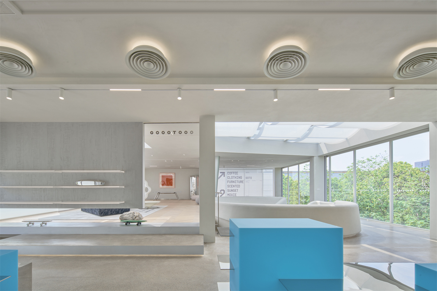 設計師將GOTO文化理解為一種“未被設定”的狀態(tài),懷揣朝著未知目的地出發(fā)的向往,回應當代年輕人自由隨性的生活方式。原建筑為機械金屬廠車間,設計師提煉GOTO的品牌調性融于設計語言,用包容而純粹的藝術柔韌度,延續(xù)場地的生命力,使原本荒廢落寞的建筑變得親和有趣。